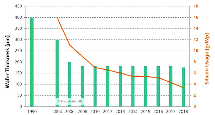 The mass of silicon per watt has fallen precipitously over time, down to 2 g/watt. A paper analyzing modern panels finds that the energy return on investment would be near 30:1 at a 12% capacity factor. Many of the largest producers hope to shrink wafer thickness again because emerging technologies like TOPCon do not lose efficiency at thinner wafer sizes. The grams per watt could easily halve. Items like aluminum frames will become the largest source of embodied energy.