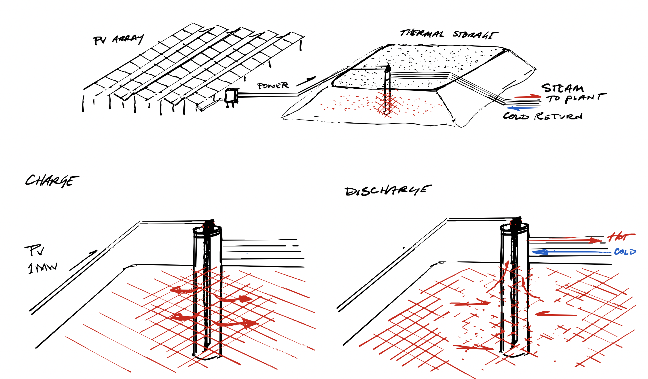 Our technology works by storing energy as heat in the least expensive storage material available - large piles of dirt. Co-located solar PV arrays provide energy (as electricity) and are simpler and cheaper than grid-connected solar farms. Electric heating elements embedded in the dirt piles convert electricity to heat. Pipes run through the pile, and fluid flowing through them removes heat to supply the customer. The capital cost, not including the solar PV, is comparable to natural gas storage at less than $0.10/kilowatt-hour thermal and 1000x cheaper than batteries.